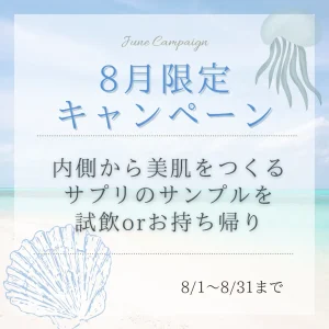 8月中のご来店で、美肌ドリンクのサプリメントを試飲またはプレゼントします。
